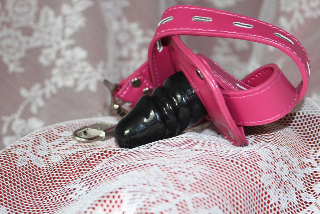 Denna gag med remmar av konstläder i fuchsia med penisformad svart dildo är utformad för att tysta din partner medan den ger full komfort.